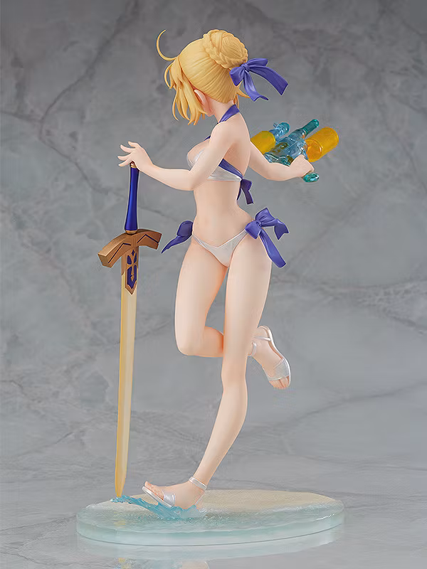 Every detail has been meticulously crafted, from her slender physique to the intricate design of her holy sword Excalibur and even the water gun filled with water. The sandy beach base, complete with splashing waves, immerses you in the seaside atmosphere.