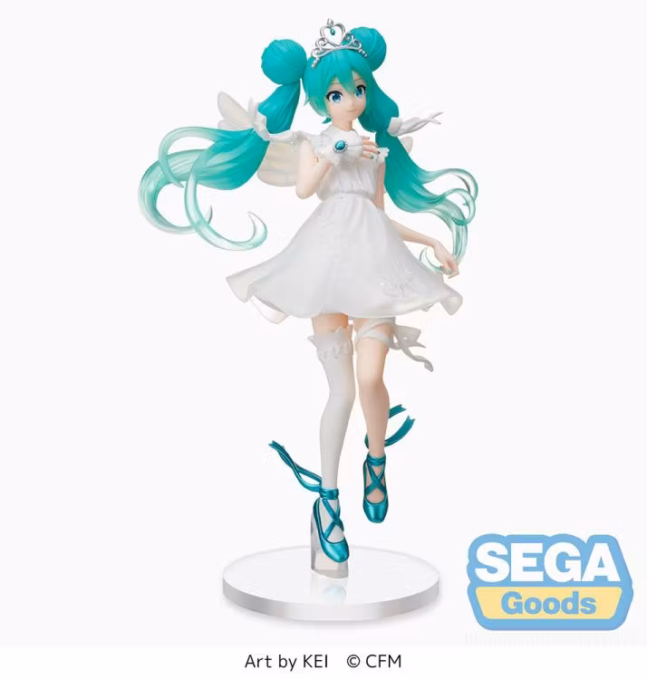 Experience the enchanting charm of Hatsune Miku as she returns to the Super Premium Figure line! Standing proudly at over 9 inches tall, this rendition features Miku adorned in her iconic twin tail buns and ballet slippers, inspired by the mesmerizing design crafted by illustrator KEI for the 15th Anniversary celebration. Don't miss your chance to add this exquisite figure to your collection and immerse yourself in the world of Vocaloid's beloved diva!